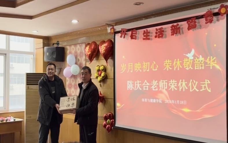 1月18日,体育与健康学院举行退休教师荣休仪式,向深耕杏坛数十载并为教育事业作出突出贡献的陈庆合教授致以崇高敬意。学院党委书记张旭尧主持会议,院长杨洪涛发表致辞并为陈庆合教授赠送纪念品。校离退办、马克思主义学院、职业教育学院主要领导及学院党政领导班子成员、教师代表参加了此次荣休仪式。