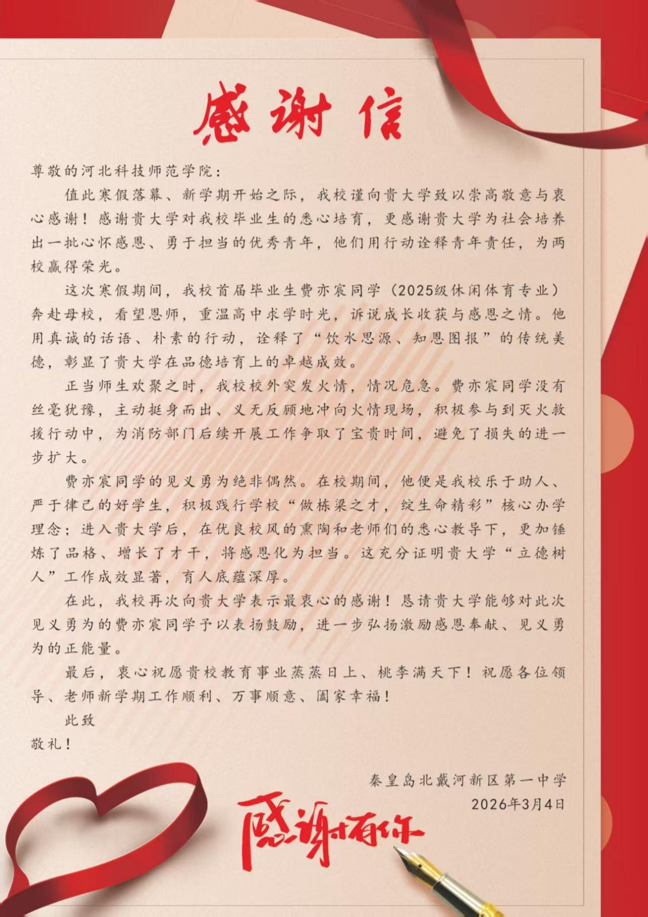 近日,秦皇岛北戴河新区第一中学向我校发来感谢信,信中高度赞扬我院2025级休闲体育专业费亦宸同学寒假期间挺身而出、参与火场救援的英勇行为,同时对我校在人才培养、思想教育引领方面的显著成效予以充分肯定。费亦宸同学用果敢的行动诠释了新时代体育青年的责任与担当,彰显了我院“立德树人”的育人成果,为全院学子树立了优秀榜样。